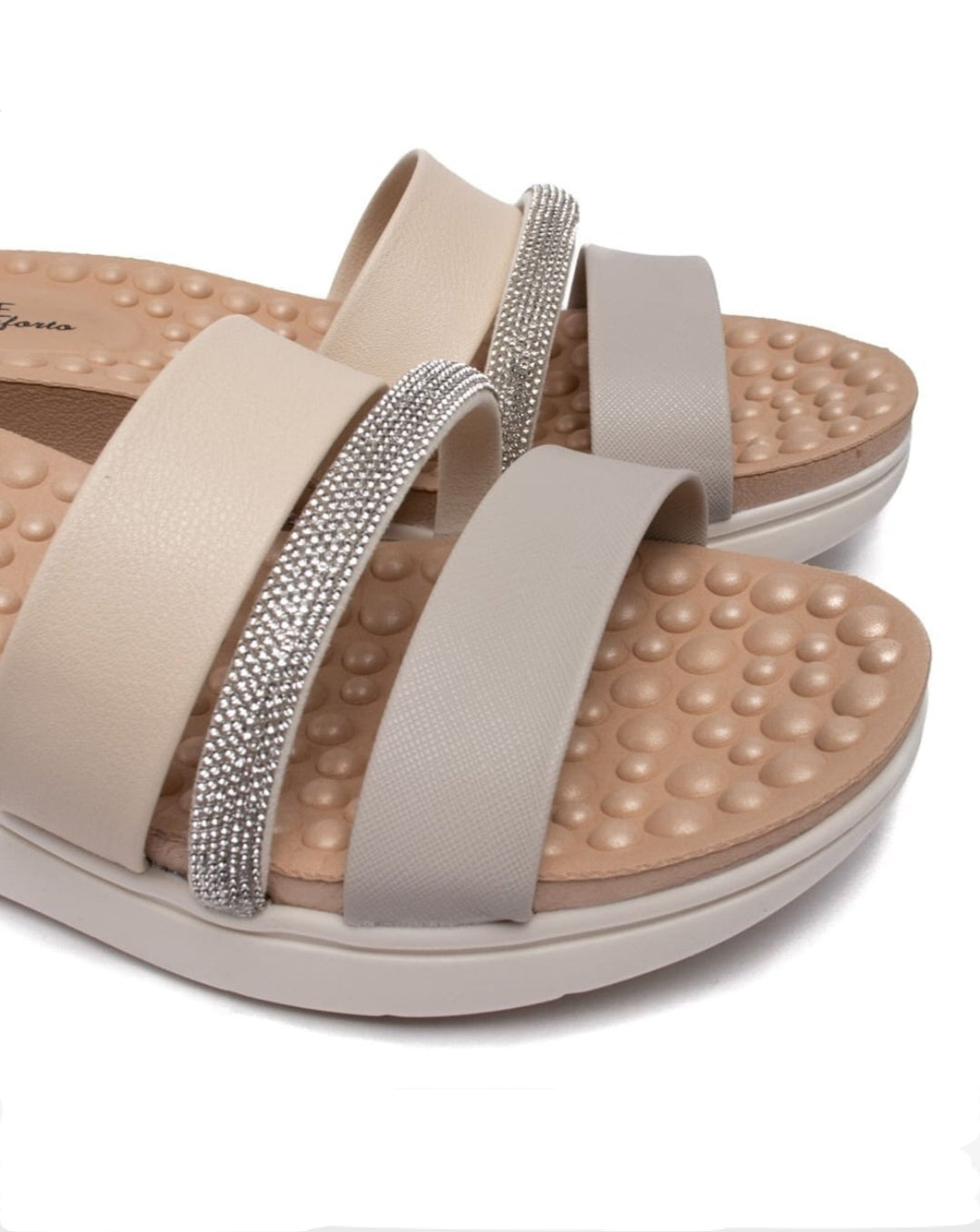 Diseño versátil con tiras en tonos neutros y un toque brillante ✨. Su tacón de 4.5 cm proporciona estabilidad sin sacrificar estilo. Incorpora una plantilla anatómica que brinda soporte durante todo el día.
